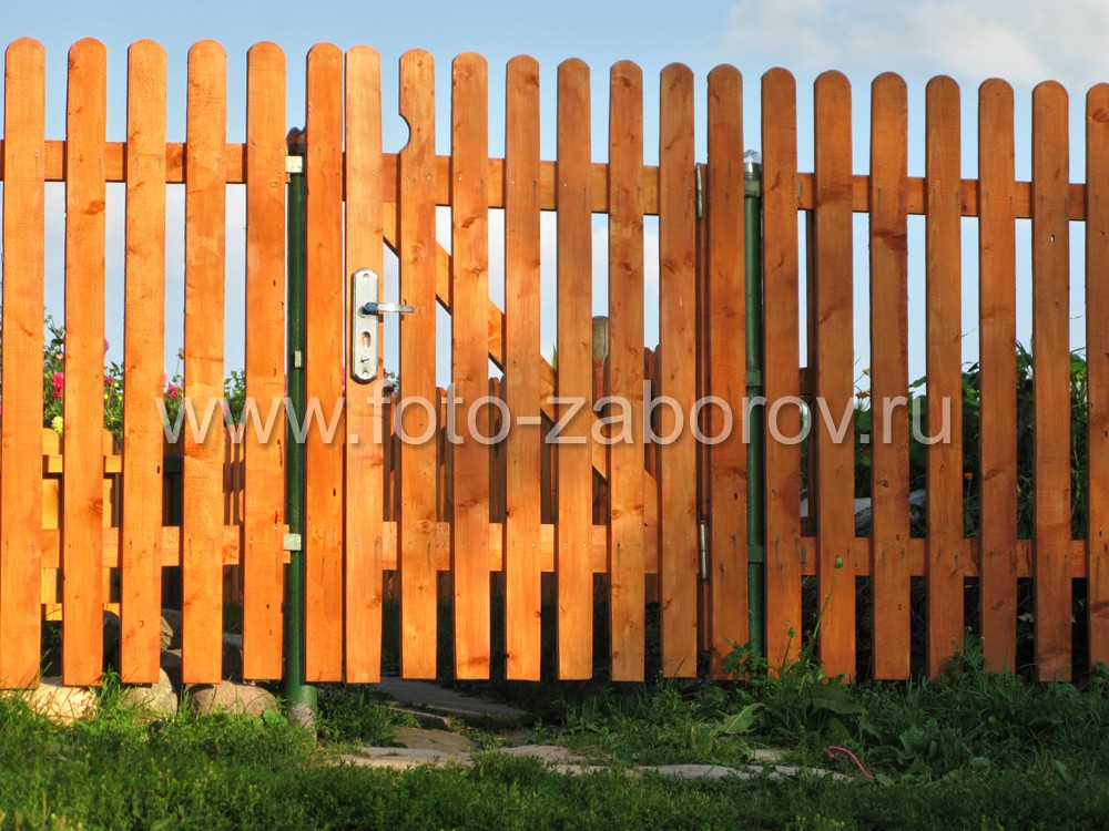 Представленный на фото деревянный штакет установлен на деревянные столбы круглого сечения. Заранее на столбы навариваются по две лапки - в верхней и нижней частях столба. Загрунтованные и покрашенные столбы устанавливаются в землю. Чтобы забор не "поплыл", основания столбов заливают бетоном. К лапкам прилаживают горизонтальные лаги из брусков сечением примерно 60 х 40 см или более того. На лаги монтируют вертикальные доски штакета при помощи шурупов, имеющих потаённую головку. Забор покрывают антисептиком, затем (опционально) красят. Можно также использовать антисептик нужного оттенка, который превратит сосновые доски по внешнему виду в дорогую лиственницу или морёный дуб =).