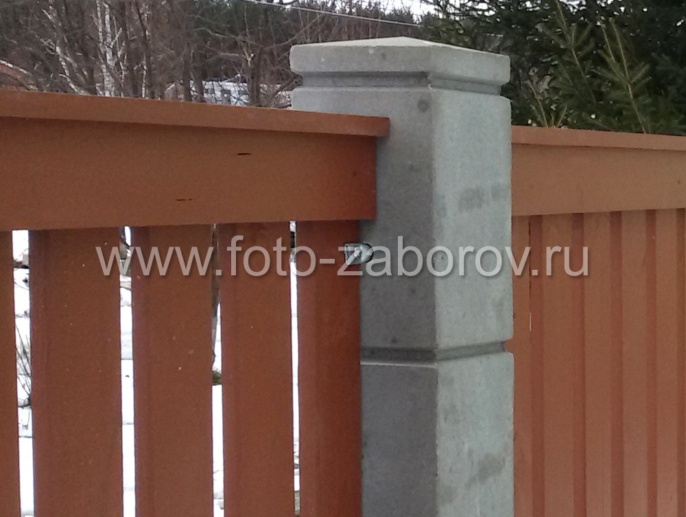 Из-за ветхости таких ограждений, заказчиком было принято решение о замене их на современное и красивое капитальное ограждение, а именно в пользу конструктива забора были выбраны бетонные «желанные» столбы и цокольные панели, а заполнения - «экспериментальные» для нас, деревянный Штакетник в цвет подшивки крыши дома. Общая высота ограждения составила 1,5 метра. Эксклюзивная входная группа - двухстворчатая калитка в одном стиле с ограждением.