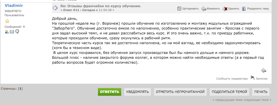 Сегодня же я постараюсь предоставить обеим бригадам доступ в закрытый форум для знакомства с профессиональной оценкой ведения бизнеса и ответов на 1000 вопросов, возникающих по ходу открытия производства. Не много не мало, но закрытый форум франчайзи живет своей жизнью и уже 11 франчайзи с сегодняшнего дня делятся своими знаниями и опытом по текущей деятельности.