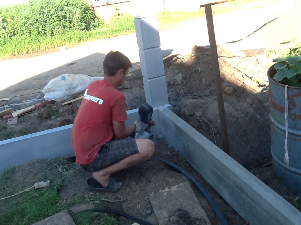 Днем учимся забивать все виды столбов, от простого, рядного, к воротному с закладными гайками, гофрой под домофон, светильник. С первого раза, конечно же, не получается, но со второго уже смотрится столб не плохо. Столб получается без трещин, затертостей, без несостыковок в рисунке. И так целый день до выпуска качественного изделия. Если сегодня к исходу дня будут косячки, то этим вопросом займемся и завтра, но уже с цепью на ноге.)))