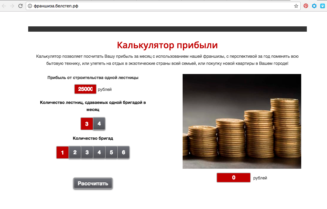 Рассчитайте свою прибыль получаемую за месяц на калькуляторе расчета прибыли. www.франшиза.белстеп.рф