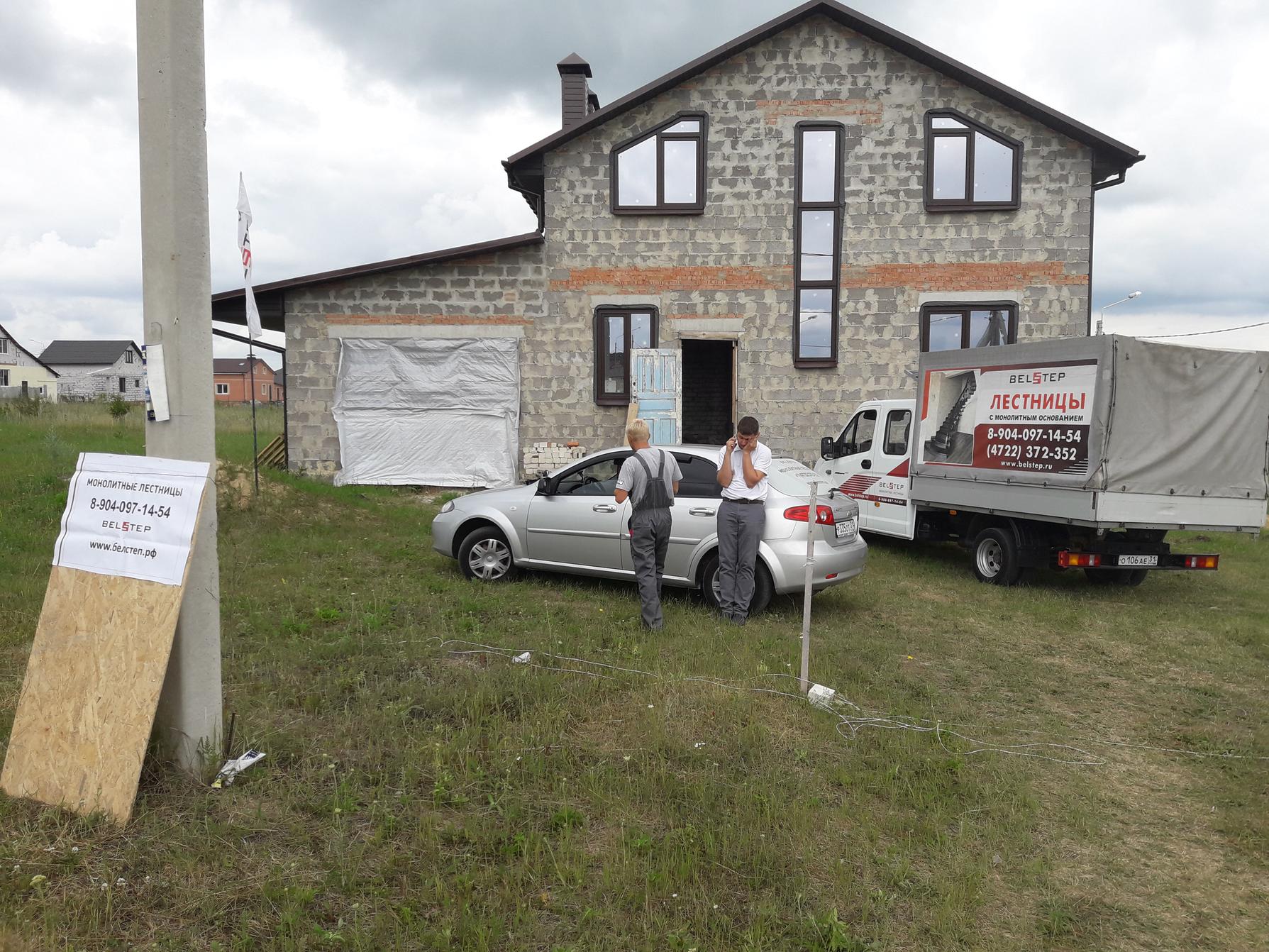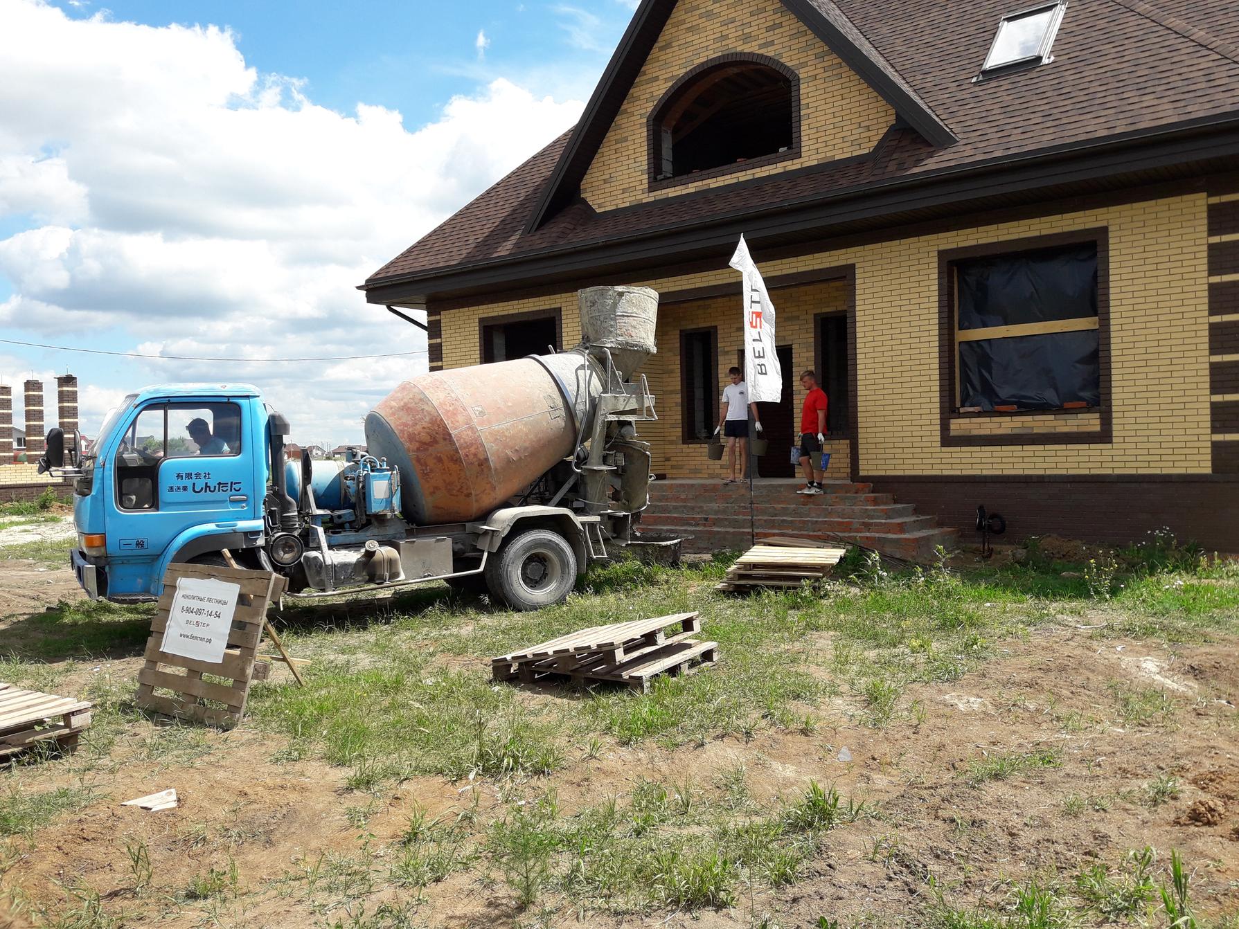 По программе курса познакомились с тремя строящимся лестницами в разных районах пригородов Белгорода две из которых ожидали поставки бетона для укладки от нашего поставщика, владеющего всеми тремя миксерами в Белгороде с 3х кубовым !!!! смесителем японцем. Что надо признать закрывает все наши потребности по доставке небольших объёмов, с возможностью ожидания при укладке раствора, в опалубку лестницы.