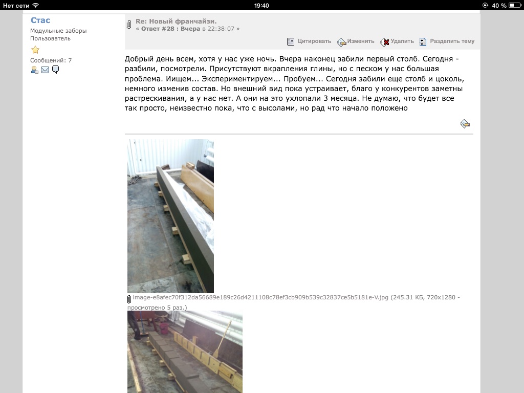 В пятницу на этой неделе приезжают на курс обучения франчайзи из Воронежа и им за неделю необходимо будет вникнуть во все аспекты деятельности компании. Уже подготовлен комплект форм? на которых и будут Воронежцы учиться практической деятельности производству столбов, цоколей и секций. Я буду вести подробное описание каждого дня по курсу обучения, с фотографиями и отзывами.