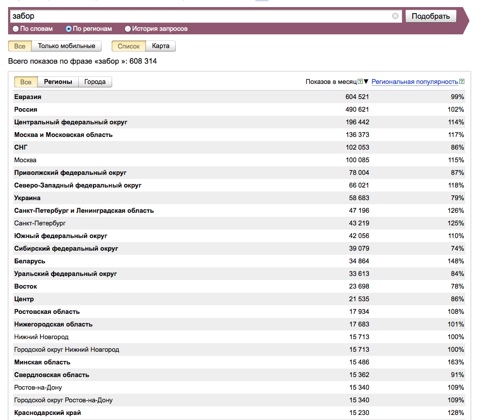 У вас появится статистика запросов по регионам России, проанализировав которую вы увидите, что эта тема более чем интересна. И она имеет явную сезонность, в то же время.