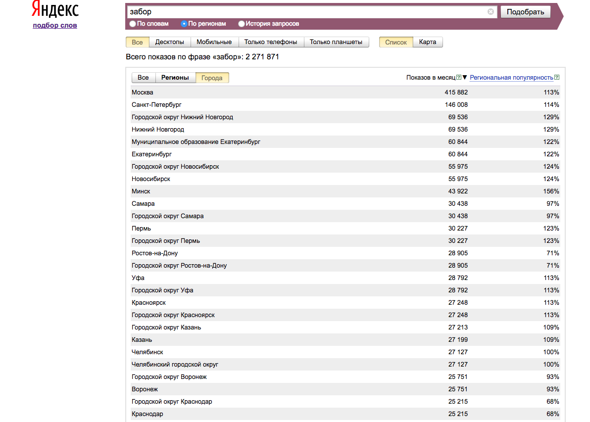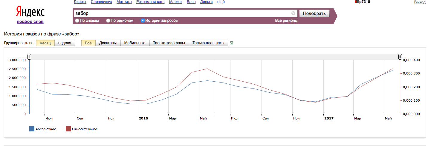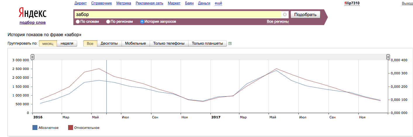 Чтобы иметь реальную статистику запросов от потенциальной аудитории по теме заборов, достаточно зайти на яндекс и в в статистике слов набрать тему "забор" https://wordstat.yandex.ru/#!/...