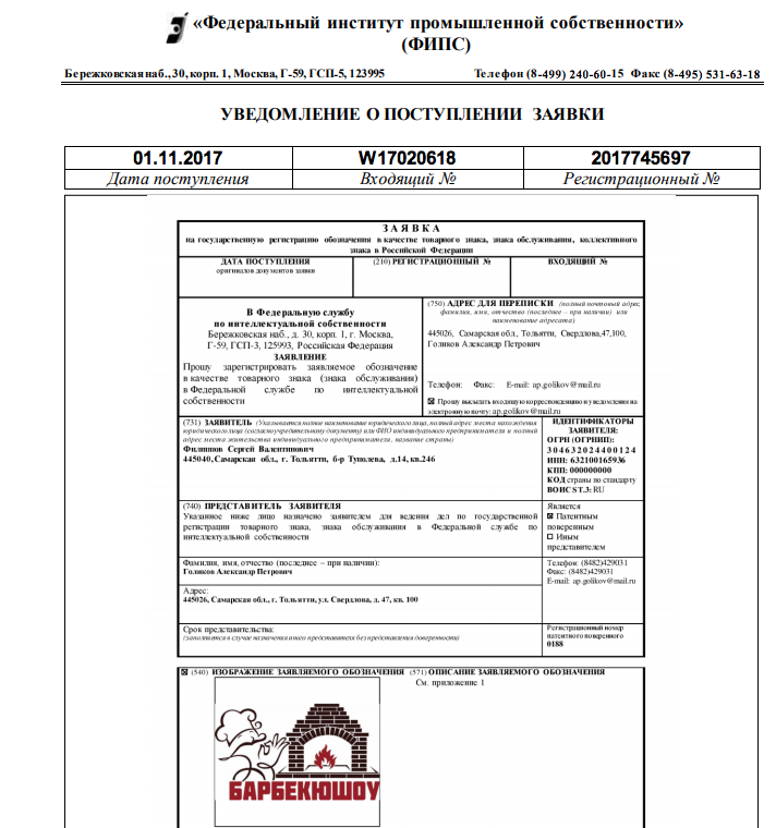 Подана заявка на регистрацию товарного знака, а неделей раньше через специализированный сервис мой патентный поверенный провел анализ существующих названий и логотипов подтвердив отсутствие подобных представленных названию БАРБЕКЮШОУ. Следовательно через 10-11 месяцев будет получено свидетельство на ТМ БАРБЕКЮШОУ.