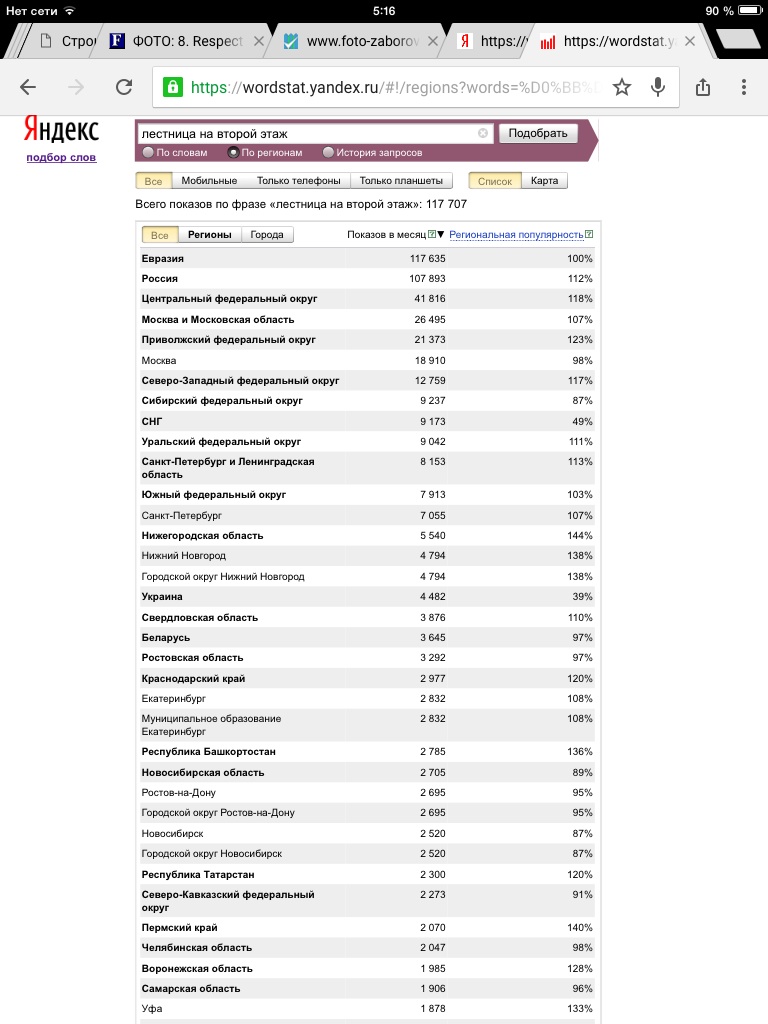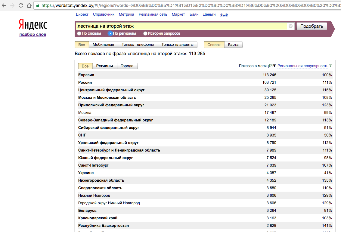 Так по запросу лестница на второй этаж в ворд стате яндекса в Уфе спрос на этот вид запроса выше по отношению в Белгороде в два раза!!!