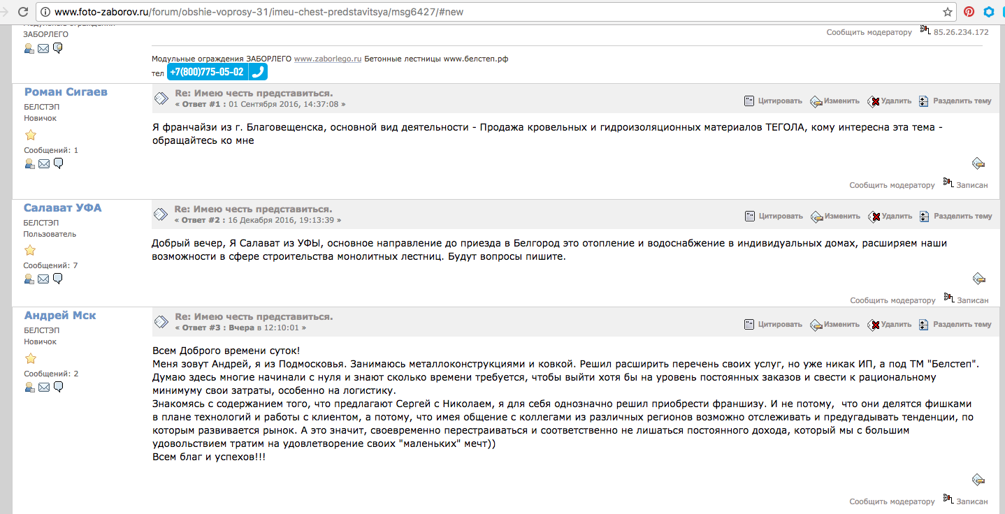 Это скрин экрана с темы закрытого форума в котором представляются наши партнеры перед началом общения по различным аспектам бизнеса БЕЛСТЕП.