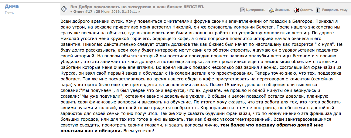 Это не пафосное заявление о бизнесе по строительству монолитных лестниц БЕЛСТЕП. Это реальность в которой предприниматель принимающий решение о начале производственной деятельности за короткий срок обучения получает практические навыки ведения бизнеса в рамках действующей компании БЕЛСТЕП в Белгороде. Не верите, тогда приезжайте к нам и вы увидите все своими глазами и если идея запуска бизнеса описанного на этом форуме будет ложью я верну вам деньги за дорогу.