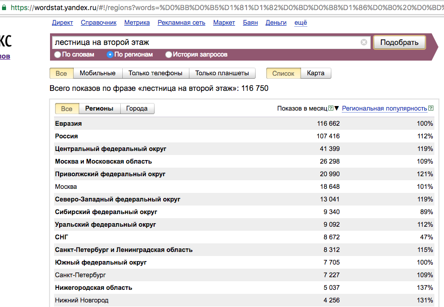 и оцените просто своими глазами спрос на лестницы в яндексе по запросу по сравнению с запросами в Белгороде.
