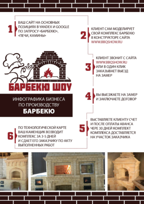 В идеи создания франшизы БарбекюШоу лежит идея не только строительства комплексов барбекю, печей и каминов, но и показать культуру приготовления различных блюд с возможностью их повторения на вашем комплексе барбекю с помощью подсказки записанной в коротком ролике.