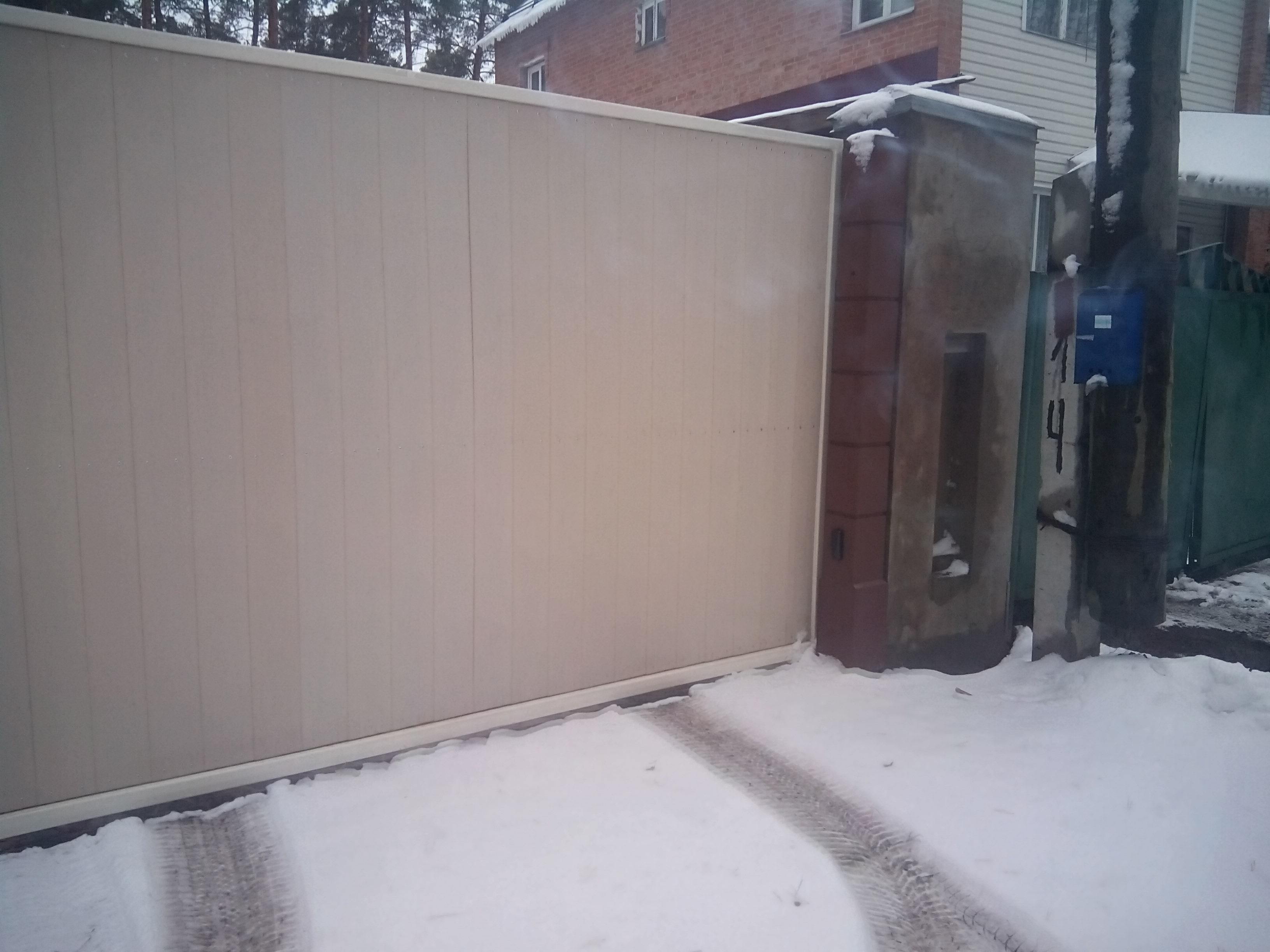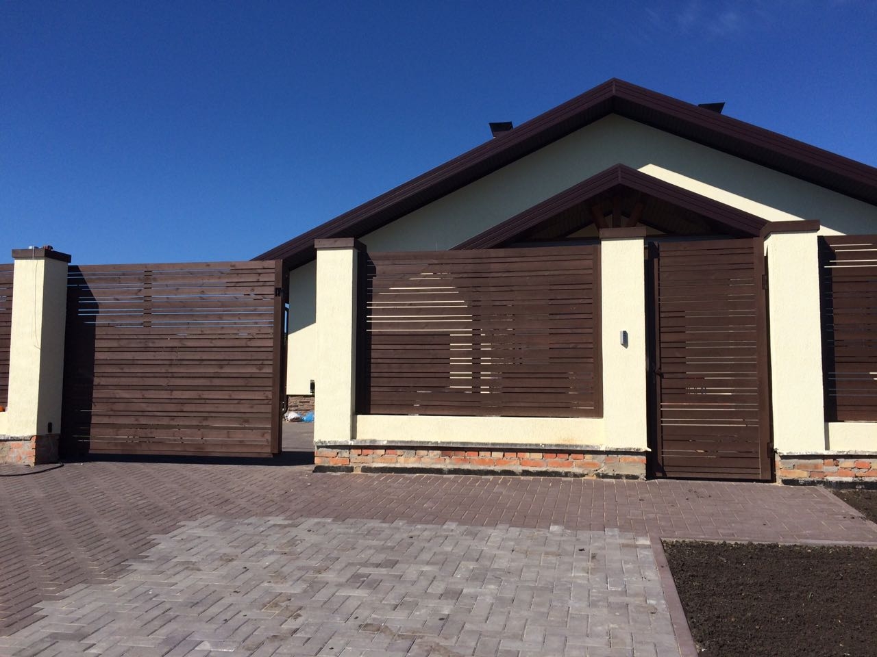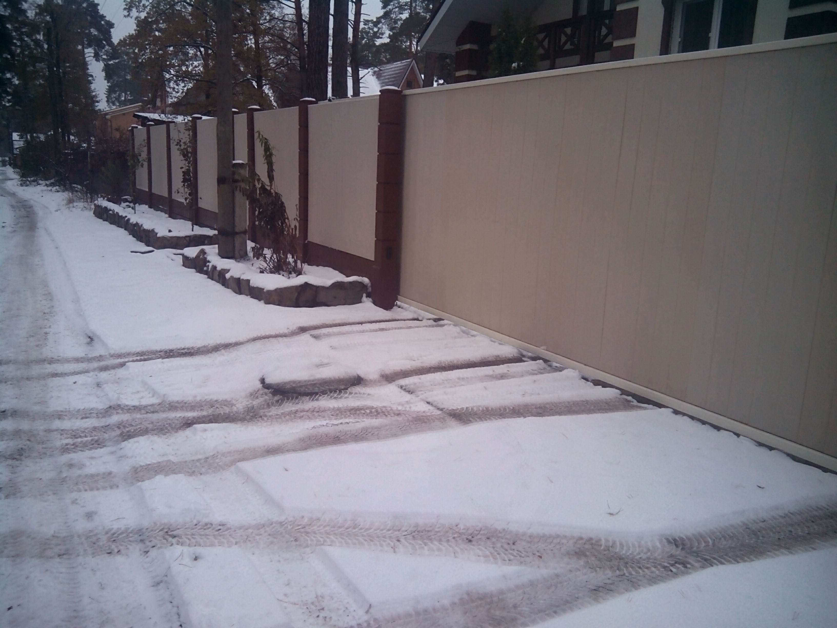 На нижнем фото видны столбы сечением 250мм во входной группе с откатными воротами.