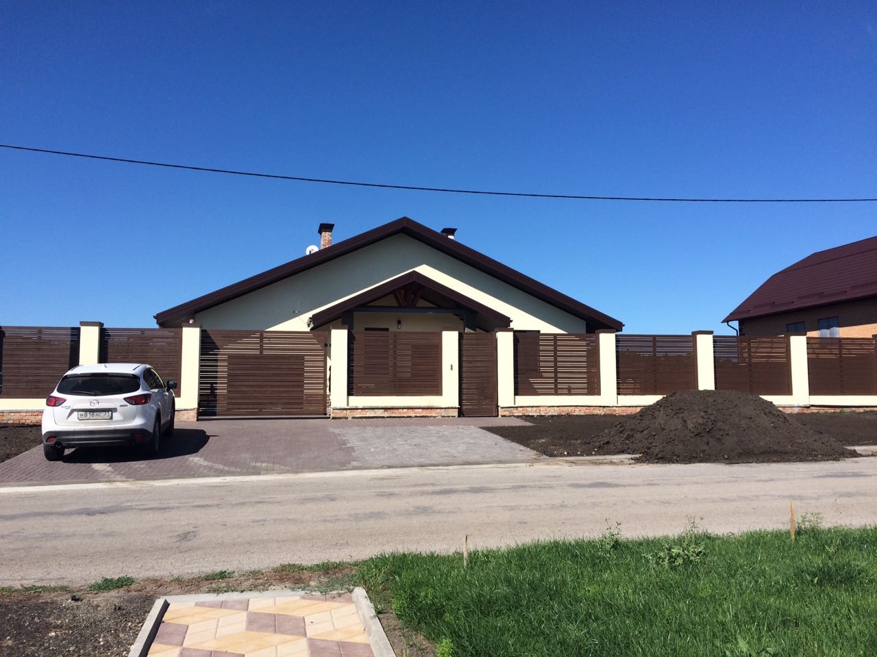Есть пословица, перед тем, как что то продать, нужно с начало это что то купить. Вот и у нас был аналогичный сценарий. Новые владельцы каменного дома решив придать своему участку современный внешний вид решили снести бетонный забор выполненный из серых панелей и поставить наш ЗАБОРЛЕГО с элементами входной группы и секции рисунка РАНЧО из дерева высотой 2м. Хотя по мне высота в 1,75 м смотрелась бы эффектней. Получилось так что пока мы сносили старый забор из панелей местные ходили и охали задавая вопрос, зачем забор то сносить бетонный. А а когда мы поставили ограждение своего производства за два дня то к нам ходили смотреть выполненную работу, как на выставку.
