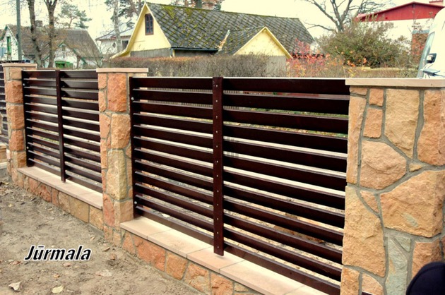 Очень красиво сочетаются такие столбы и профлист, необычно. На мой взгляд идеальное ограждение это профлист, долговечный, но скучно смотриться единым полотном. В таком исполнении-идеальный вариант