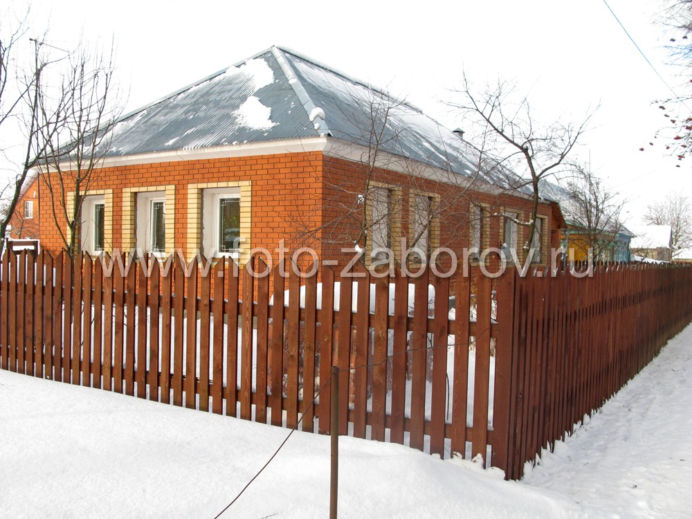Штакетник ограждает небольшой палисадник у дома. В отличие от обычного забора, доски штакетника, представленного на фотографиях, имеют скошенный верх, образованный соответствующим углом среза. Фактически, автору забора удалось получить оригинальный внешний вид ограждения без дополнительных затрат.