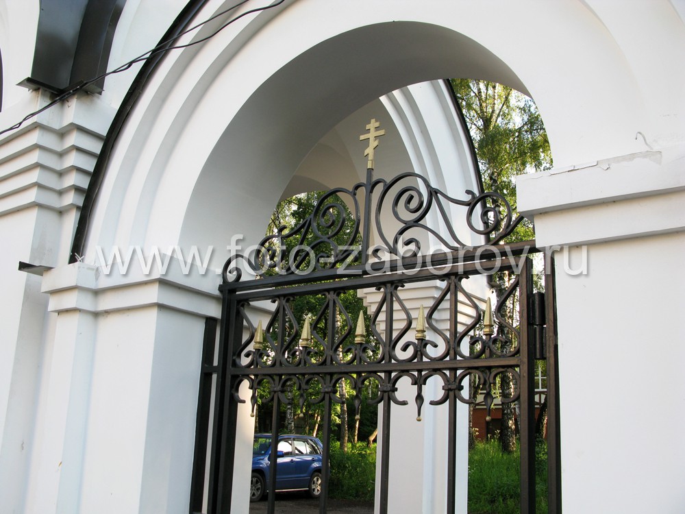 Красивая церковная ограда с выразительной надвратной ротондой. Обилие кованых элементов. Краска с позолотой.
