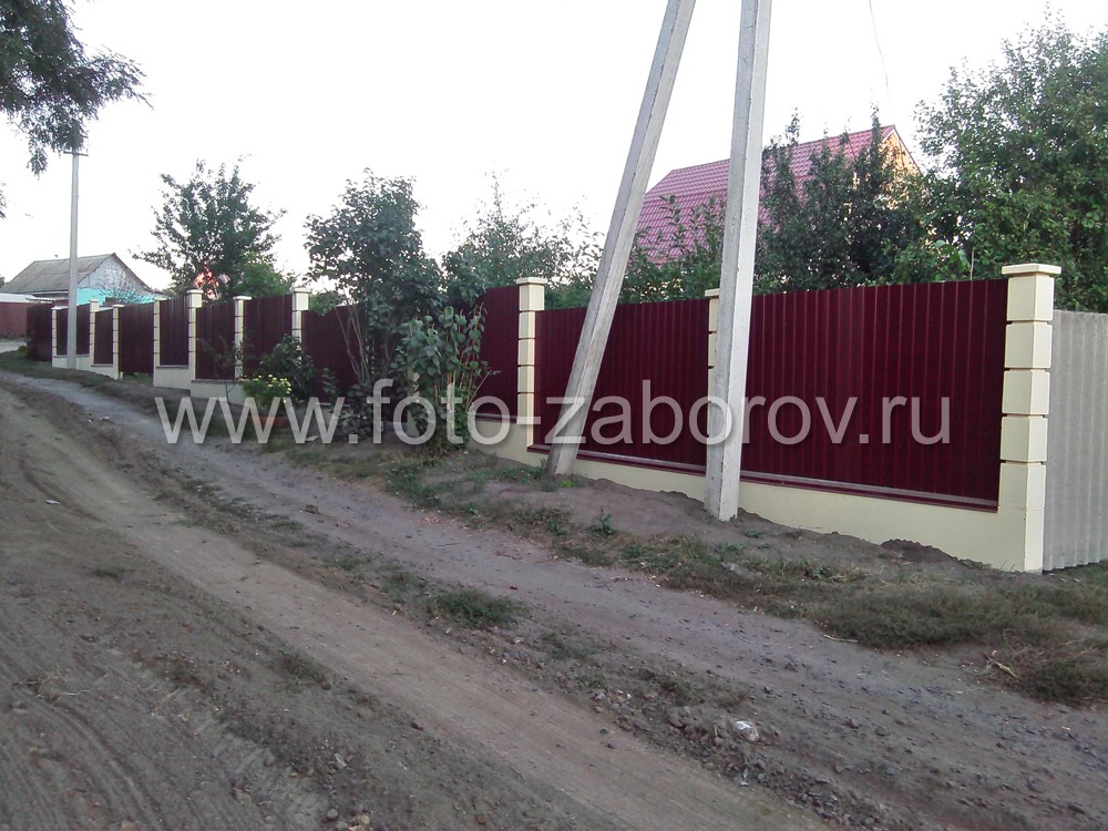Дизайн, технологии, материалы: каркас фасада: столбы из прессованных песко-бетонных блоков, сплошной высокий цоколь (без дренажных отверстий); пролёты с двумя лагами; обшивка - профлист "Красное вино" (RAL 3005); ворота распашные, калитка.