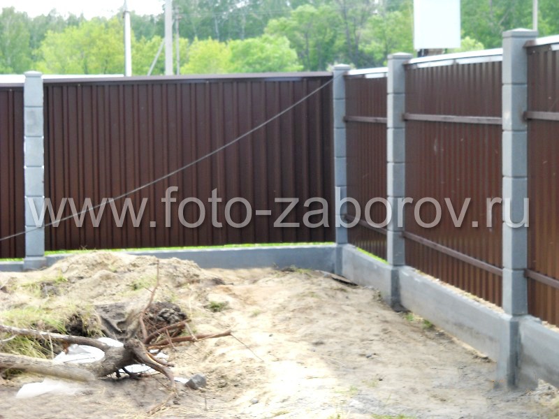 На фотографиях показан комбинированный забор на этапе строительства: установленные столбы из прессованного бетона, но без обшивки. И также: забор в готовом виде.
